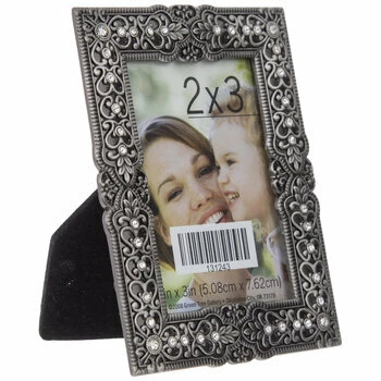Choose a simple, yet elegant, piece to make a sophisticated impression in your home. Antique Pewter Rhinestone Scroll Frame features a gorgeous, antique pewter color with a plethora of tiny, rhinestone accents along a scroll design. This beautiful, metal frame with a glass front will make an elegant statement in any room it is placed in.