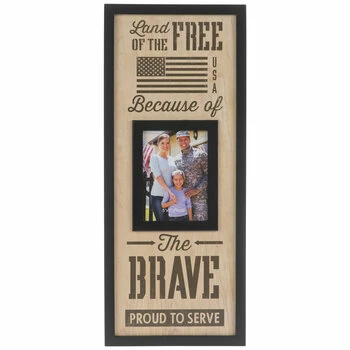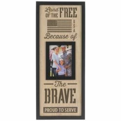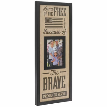 Show off your appreciation for family and friends who serve! Because Of The Brave Wood Wall Frame boasts an MDF design with solid black trim and a wood grain background. The photo in the center is surrounded by stylish typography and an American flag design. Insert a photo of the soldier in your life behind the glass!