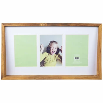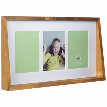 Create a display of cherished memories with this Brown Wedge Wood Collage Wall Frame. This rustic collage frame has a caramel-colored woodgrain finish, and one of its long edges is thicker than the other, giving it a wedge shape. It features three photo openings that are protected by a glass screen and a solid white mat with a cream-colored core that’s visible around the edges of the openings. Fill it with meaningful images that are worth putting on display.