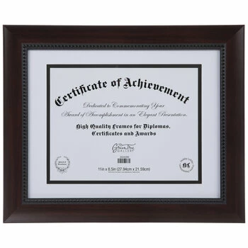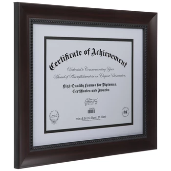 Celebrate each and every accomplishment you make! Brown Wood Document Frame is made from MDF with a red-brown wood grain finish. The frame has a black beaded interior edge around the opening, a glass pane, and a white mat. Place a diploma, college degree, or any other document inside!