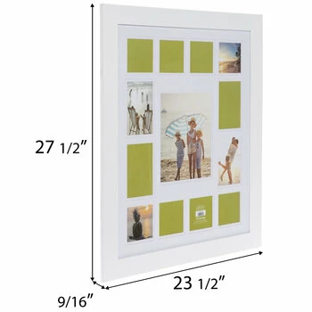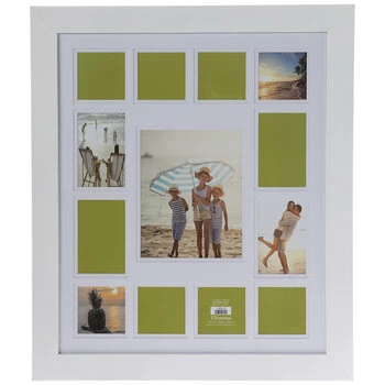 Keep it simple and let your memories stand out on their own with this White Wood Collage Wall Frame! This MDF and glass frame boasts thirteen openings with a crisp white mat to accentuate each photo. The outer frame is glossy and white with a flat profile. Hang this on your wall with curated photographs for a delightful gallery contained within a single frame!